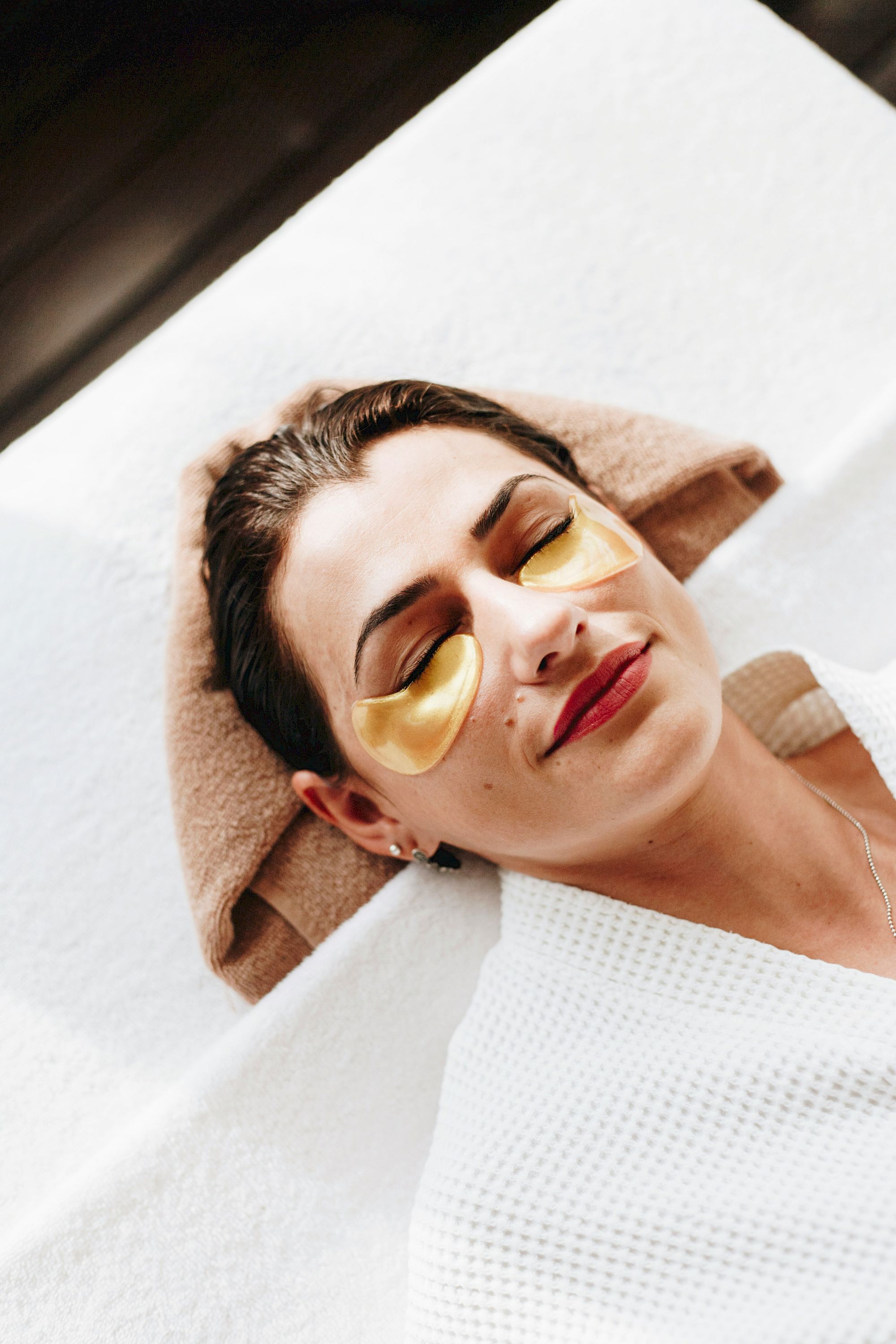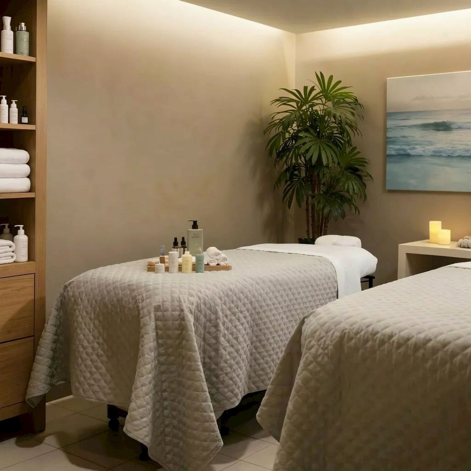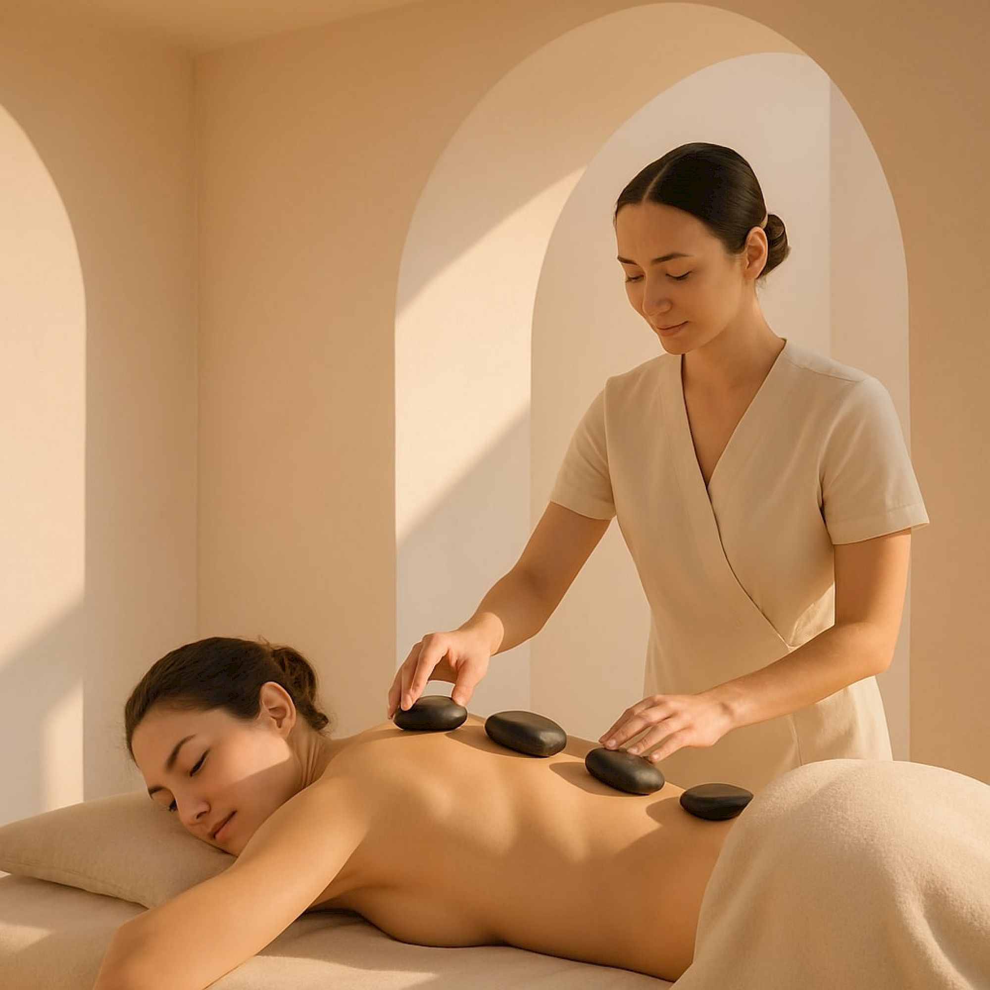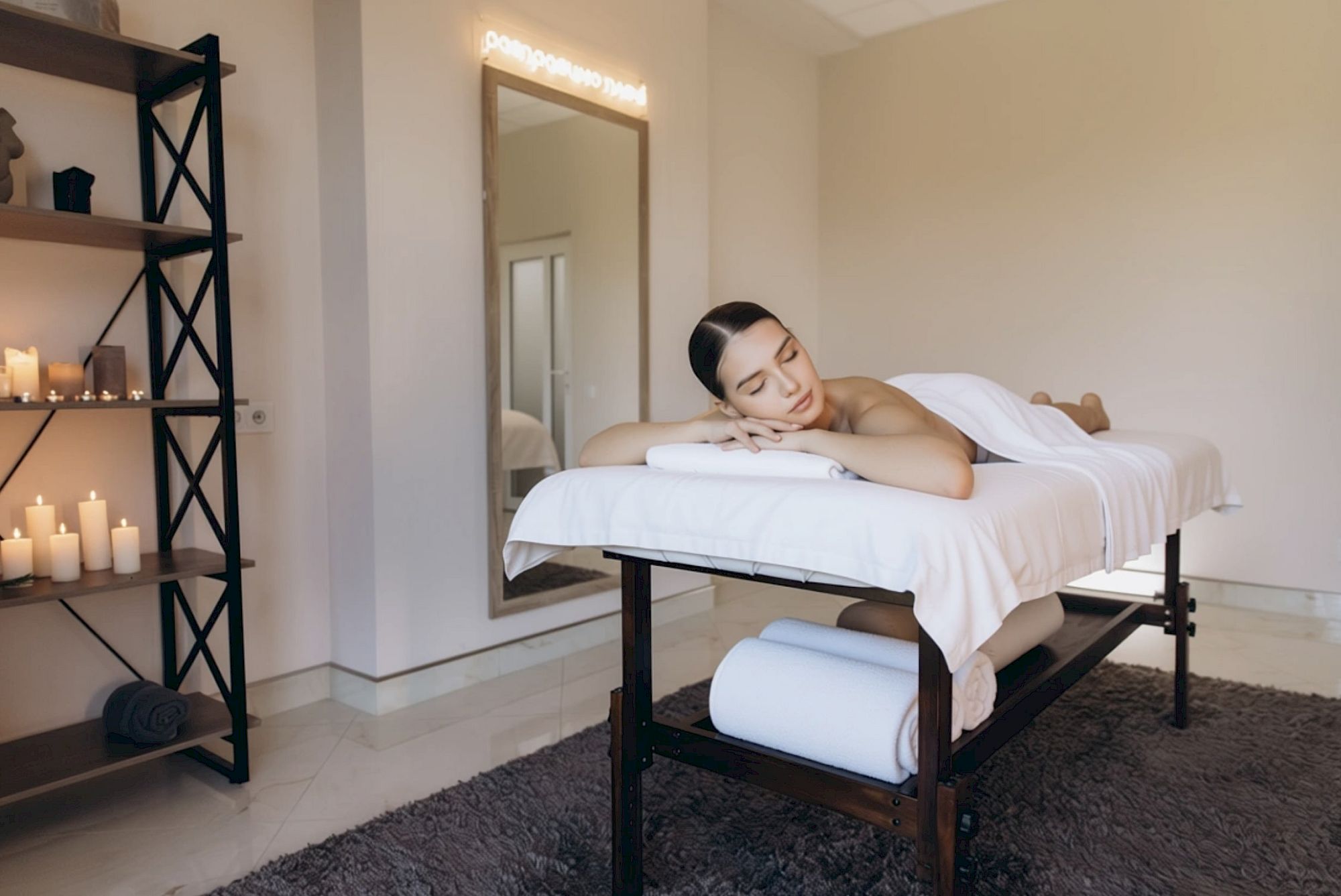 A person receiving a relaxing head and neck massage in a calm spa setting, with towels and soft lighting.