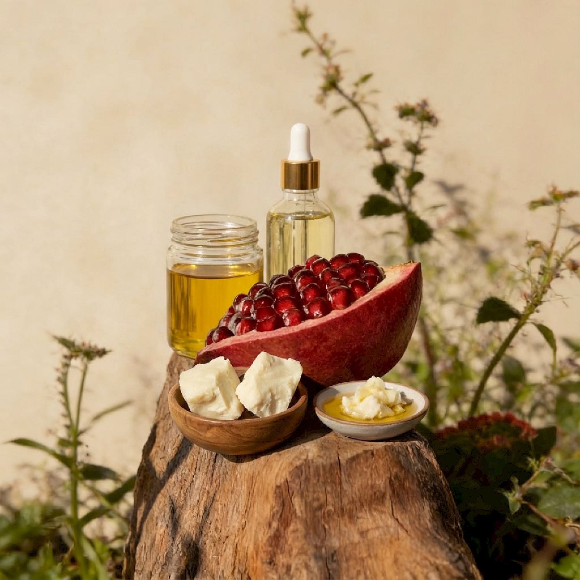 A rustic skincare setup on a tree stump: honey, a dropper bottle, red fruit in a half-slice of watermelon, and small bowls of cream and butter, outdoors.