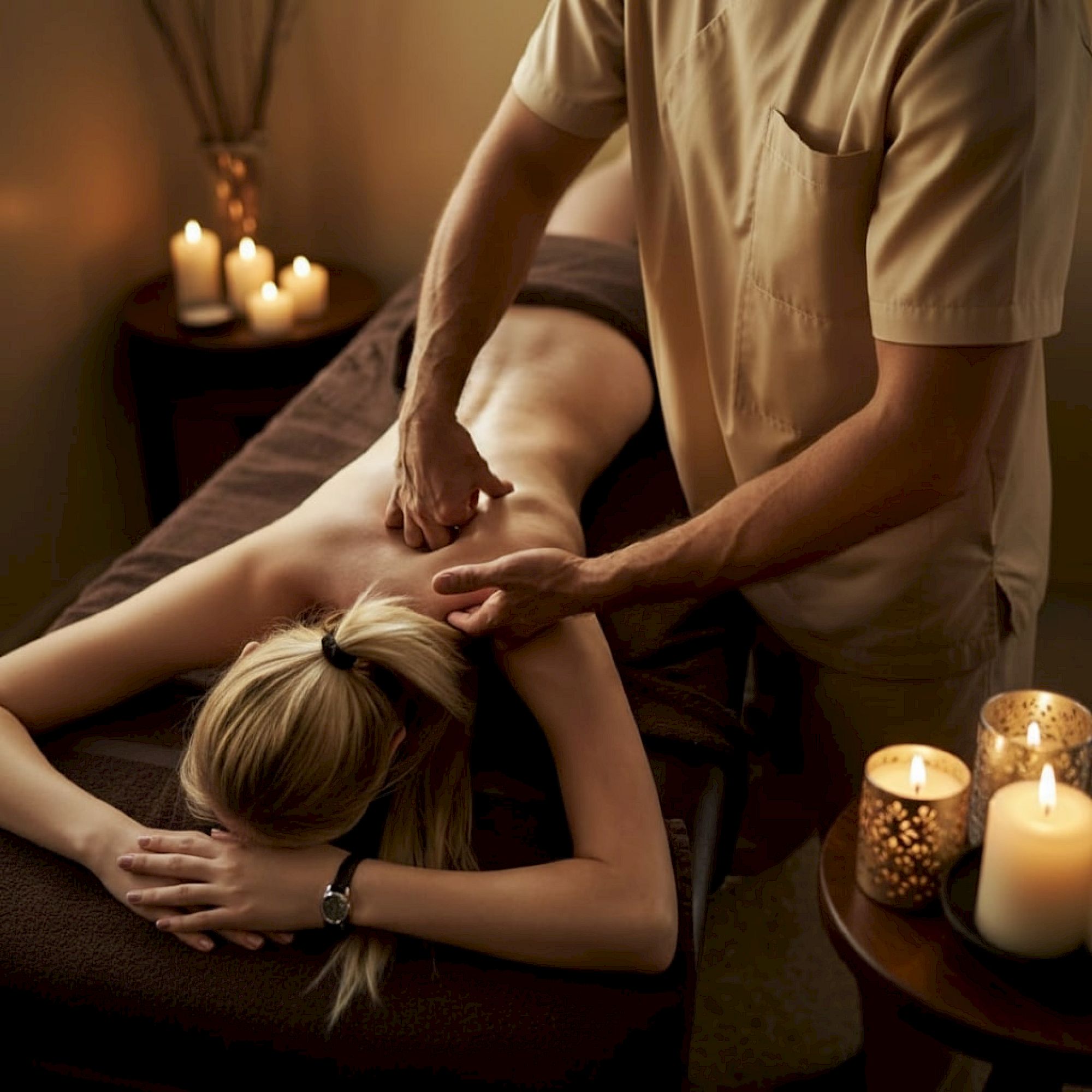 Massage therapist giving back massage with essential oils and candles for a relaxing spa vibe.