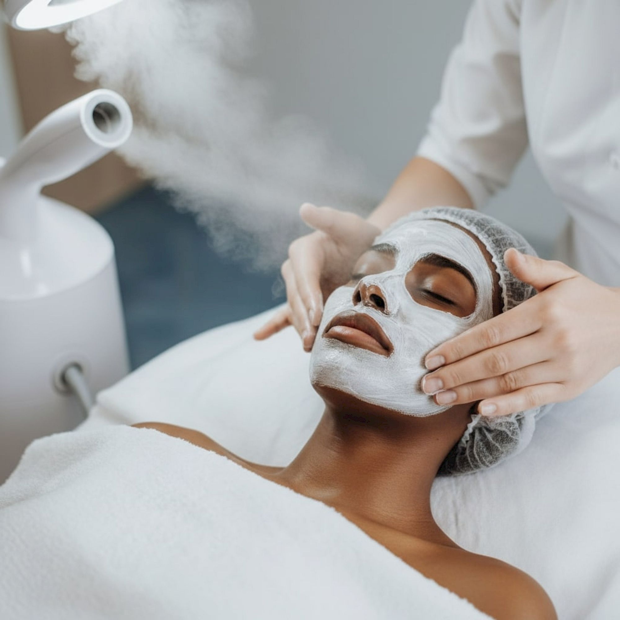 A person wearing a headband is getting a facial treatment; a practitioner applies a white cream or mask to their forehead.